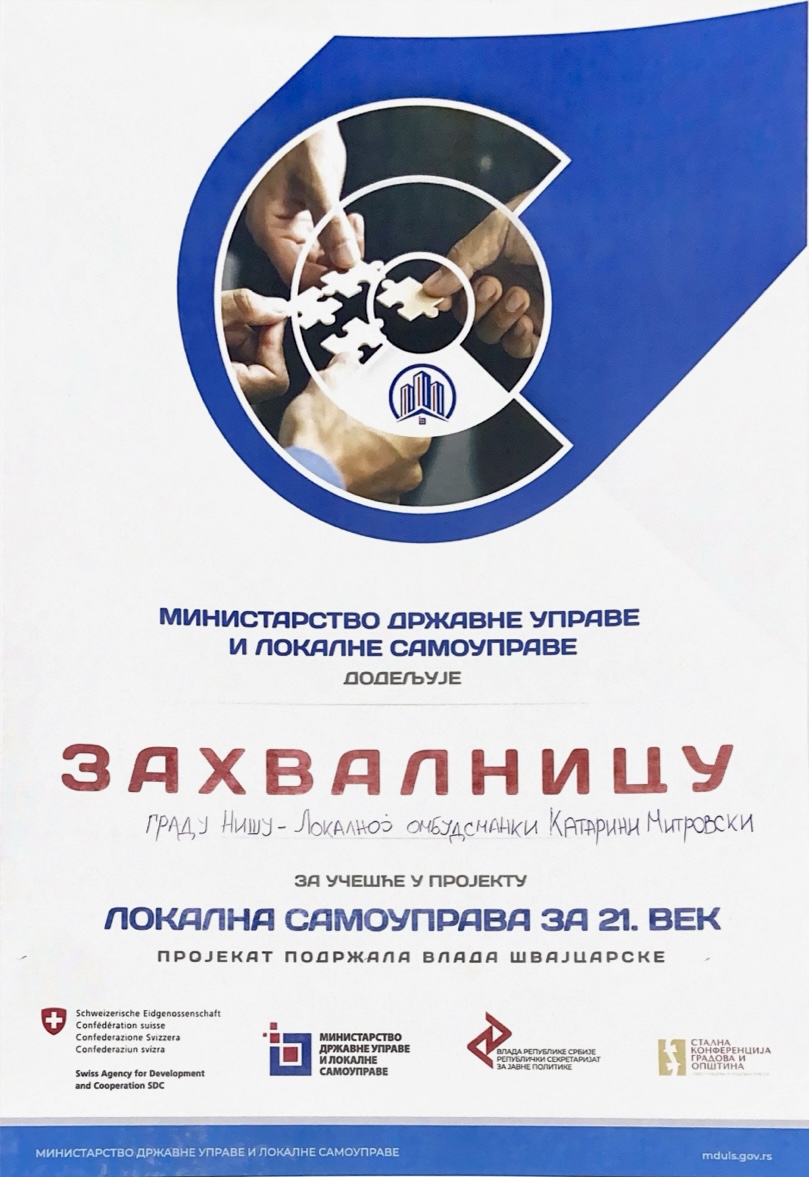 За реализацију овог пројекта, добили смо захвалницу као признање за постављање примера и симбола за остале локалне самоуправе широм Србије које ће следити наш пример.